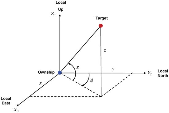 An IRST sensor measures the bearing and elevation angles of a target [5,8], as shown in Figure 2. We note that the bearing () and elevation () angles depend on the relative position in Cartesian and polar velocity-based models. Hence, for both type of state vectors, the measurement model for the bearing and elevation angles is described by