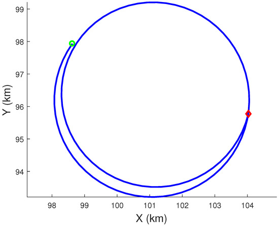 The IRST sensor trajectory and parameters in the simulation are similar to those used in [8,31]. The target moves with an NCT motion in a plane parallel to the -plane and moves with an NCV motion along the Z-axis. Table 2 presents prior mean polar velocity-based state parameters of the target. The NCT motion has a centripetal acceleration of 3 g, where . This scenario was used in [5]. We use the same filter initialization with that in [54] in the current study. The prior variance of the 3D polar velocity-based state is chosen as