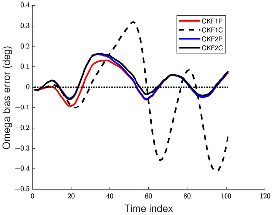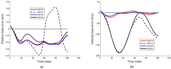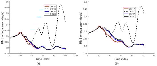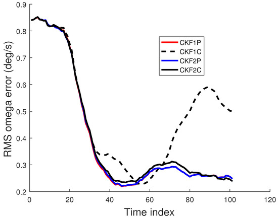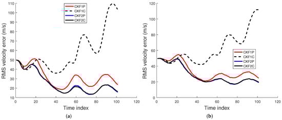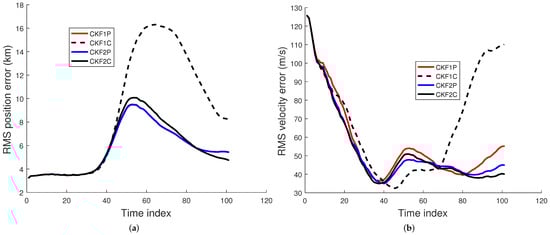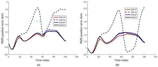 An IRST sensor on another maneuvering aircraft collects azimuth and elevation measurements. The accuracy of the angle measurements by an IRST sensor is usually high (1 mrad). The data rate of an IRST sensor is also high (1 Hz). As sensor technology improves, these factors are expected to improve. The AOF algorithm is required to process the sensor measurements sequentially in real time. Thus, a batch algorithm is ruled out for this tracking scenario. As discussed previously, a PF is not considered for this problem due to its lack of state estimation accuracy and high computational cost. It has been observed in [33,34,35] that when the measurement accuracy and data rate are high (which is true for the current problem), the UKF and CKF have nearly the same accuracy, and the accuracy of the EKF is somewhat lower. If the dimension of the state is n, then the UKF and CKF have and sigma points and cubature points, respectively. As a result, the computational cost of the CKF is lower than that of the UKF. If , then the first weight in the UKF becomes negative and the rest of the weights are positive. On the contrary, each of the weights in the CKF is positive and equal to . This negative weight may cause a filter-calculated covariance matrix to be non-positive definite in some cases [27]. The CKF was also successfully used in our previous work on AOF in [9]. Hence, we chose the third-degree spherical–radial cubature rule-based CKF [27] to estimate the seven-dimensional state of the maneuvering target. The CKFs using the Euler and TS2 approximations are called CKF1 and CKF2, respectively. Thus, we consider four CKF filters; CKF1P, CKF1C, CKF2P, and CKF2C, where the last letter in the filter refers to polar and Cartesian velocity states.