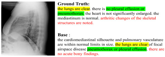 Table 2 summarizes the performance of all experimental results and of other models. As can be seen from Table 2, we conducted our experiments by applying our methods one by one and finally by applying all the methods. Overall, our models outperformed the baseline. Two experiments (R2Gen + GLVE, R2Gen + CEDT) which applied each of our methods to the baseline showed better performance than the baseline. This indicates that each of our methods is a meaningful method, showing performance improvement. R2Gen + GLVE showed good overall performance for metric, but the worst performance for BLEU-4. However, R2Gen + CEDT showed the best BLEU-4 score. CEDT showed strength in continuous text generation and made a good quality report when analyzing the generated results directly. This example is additionally analyzed below based on Figure 6. In addition, R2Gen + pre-trained GLVE + CEDT showed the best scores, by 5.62% in BLEU score, by 0.56% in MTR, and 1.98% in ROUGE-L compared to R2Gen. When the GLVE and the CEDT are combined, the overall score was the highest and the overall text was well generated. Our methods were well combined and showed higher performance than when only each method was applied alone. GLVE’s global and local features stored at various levels of the CEDT’s encoder were used without being lost during the decoding process. As a result, our full model showed great performance. However, as for the quality of the generated report, R2Gen + CEDT was the best. We found that pre-trained GLVE sometimes generates repetitive patterns that often appear in the training dataset. It was found that the diversity of the generated text was slightly reduced. This shows the weakness of GLVE in association, with BLEU-4 being the lowest.
