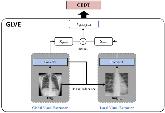 where is the patch feature of the cropped image, which are extracted from the local visual extractor. The global visual extractor can then extract the global features so that they accurately capture the size of an organ or bone structure. Additionally, the local visual extractor reduces noise and provides improved alignment. , the concatenation of and , are used as the input of the encoder of the CEDT as shown in Figure 3. For better extraction of both global and local features of the images, we pre-train the GLVE with Chest X-ray14.
