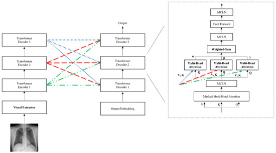 We propose the CEDT to obtain both low and high-level information in an image based on R2Gen [1]. The CEDT connects between layers of the transformer, as shown in Figure 4. The standard transformer uses only the last layer information of the encoder, but we also use low features additionally to avoid losing information on the input image features of the encoders. We modify it by using the idea of meshed-memory paper [6], which stores all the encoder’s outputs and uses it in the decoder. We use the outputs of all the encoders on each decoder with multi-head attention and weighted-sum, as shown in the gray-dashed box in Figure 4. For these values, parallel multi-head attention is performed within each decoder to obtain all-level information of the encoder. In addition, each result of multi-head attention is a weighted sum with parameters α, β, and γ. These parameters are used to control the amount of information in low-level features and high-level features extracted from the encoder. The connection between the encoder and decoder layers makes use of more information from the image features in the decoding process. This is because different levels of abstraction information for image features existing in each encoder layer are used in this structure. As a result, the model generates better captioning by adding the features extracted from each layer of the encoder than the predicted caption of the baseline.
