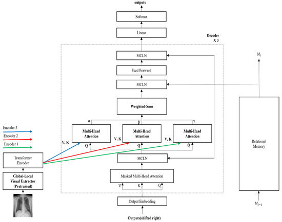 In addition, studies on medical image captioning also have been active [8,9,10]. Baoyu et al. [11] introduced a co-attention (CoATT) mechanism for localizing sub-regions in the image and generating the corresponding descriptions, as well as a hierarchical LSTM model to generate long paragraphs. In addition, the cooperative multi-agent system (CMAS-RL) [12] was proposed for modeling the sentence generation process of each section. Chen et al. [1] proposed a memory-driven transformer structure. Relational memory was used to remember the previous generation process and was integrated into the transformer using the memory-driven conditional layer network. Guan et al. [13] proposed an attention-guided two-branch convolution neural network (AG-CNN) model to improve noise reduction and alignment. After learning about a specific area for analyzing each disease through a local branch, the information lost by the local branch was compensated by integrating the global branch into it. By incorporating this into the GLVE module of our model, both global and local features can be extracted from images. In addition, inspired by Chen et al. [1], we added the relational memory and memory-driven conditional layer to our model for reflecting captioning of similar images.