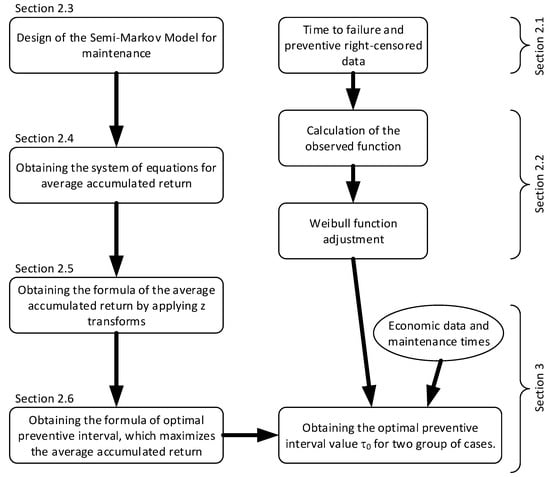 To adapt the preventive interval to the particular equipment conditions usage, the manager responsible for maintenance should use the information generated by the equipment itself. The failure information generated is right-censored and it is a challenge to determine the behaviour before the failure of the equipment. The method followed to find the optimal interval when the available failure data is right-censored is explained throughout the article. This process is graphically summarised in Figure 1.