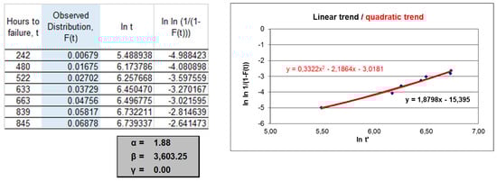 In Figure 2, the procedures for the data in Table 3 and Table 4 are summarised. The Weibull failure distribution function that best fit the observed function had two parameters, the shape parameter with value 1.88 and a scale parameter (characteristic life) with value 3603. These data were very different from the data obtained for the case of uncensored data and would give rise to a very different preventive interval. The detailed process for the data in Table 1 and Table 2 can be verified in Sánchez-Herguedas et al. []. The Weibull functions adjusted to the uncensored data were, in that case, W(2.36, 1317, 0) and W(1.95, 1202, 117), where the first value corresponded to the shape parameter, the second to the scale parameter, and the third to the guaranteed life parameter.