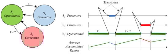 On the other hand, during the operational state, the equipment generates income. Over time, these costs and income are accumulated in a variable called the average accumulated return, . The optimisation of this variable will allow the calculation of the optimal preventive interval, . These transitions between states and the accumulation of returns are graphically expressed in Figure 3.