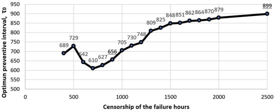 In Figure 4, an abrupt change in the direction of the curve is observed. It can be seen that for values greater than 700 h (point 700 on the abscissa), the curve experiences a change in trend that is maintained until the end. This indicates that the behaviour of the fault distribution function should be studied when the number of failures is very small compared to a large number of censored data due to preventive maintenance. In this case, from values above 75% of the right-censored value (value of the adopted preventive interval), we can find values with which to obtain good to good results.