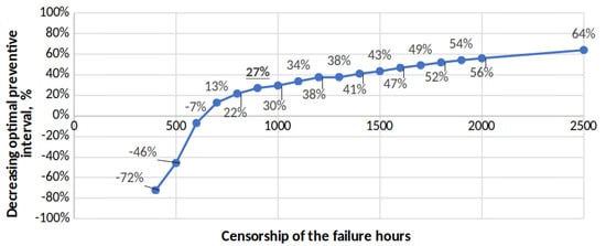 Subsequently, the value of the preventive interval was modified, settling at 1000 h. In this case, the failure data were considerably reduced as many observations were right-censored by the predetermined preventive maintenance performed at 1000 h (scenario B). This censorship radically changed the way of analysing the problem, since the results will depend less on the type of technique or method used and more on the type of censorship [] and the extent of the censorship. Scenario B, corresponding to the preventive interval of 1000 h, is the one that is usually presented to the maintenance manager.