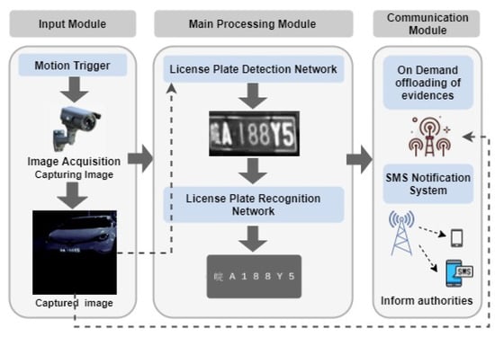 The proposed system design consists of three main modules: input module, main processing module, and communication module as shown in Figure 1. The input module captures the vehicle images and feed them to the main processing module. Meanwhile, the main processing module performs the core functions of the system, which are license plate detection and recognition. Upon the retrieval of results from the license plate recognition stage, the communication module handles the data communication between the ALPR system and its operators. Figure 2 shows the hardware stack of our solution. The corresponding hardware specifications are given in Section 3.1.1.