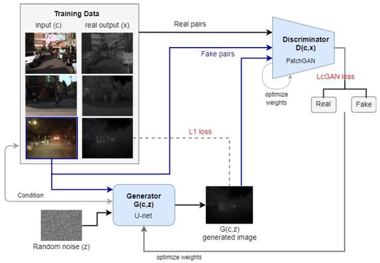 The process of generating the synthetic TIR images used by this work follows a method proposed by Zhang et al. [49]. As shown in Figure 7, we used a GAN-based pix2pix model for image translation and provided the model with a paired set of training data that includes matching frames in both RGB and TIR images. To train the model for TIR image translation, we selected the largest available multi-spectral dataset named KAIST [72] that has a significant amount of matching RGB and TIR images. Finally, we trained the pix2pix model and initialized the weights from a Gaussian distribution with a mean 0 and standard deviation of 0.02. The input images were enlarged to 480 × 480 pixels and the network is trained for 100 epochs with a decaying learning rate of 0.0002, lambda_l1 of 120.0 and keeping other parameters the same as the original pix2pix study. Then we used this trained pix2pix model to translate the daytime RGB images of the CCPD dataset [14] to TIR and used that synthetically generated nighttime images of CCPD to train the detection models of our pipeline. To train the recognition models, we required comparatively high-quality nighttime images of the license plates. Therefore, we converted the RGB images to grey-scale using matplotlib Python library and set the colour map to grey. Herewith, we preserved the image quality and avoided generating incomplete license plate characters that are impossible to read.