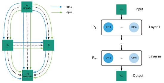 Figure 8 (left) shows a simple case with only 2 intermediate tensors namely and . The tensor is the input to the super-network and tensor is the output of the super-network. We call the number of intermediate tensors as the depth of the network in our implementation. As shown in the figure each tensor is connected to every one of its predecessors using all the operations in the search space. For brevity we have shown only op 1 and op n in the figure. For our architecture search process these operations are the neural blocks described in the previous section.
