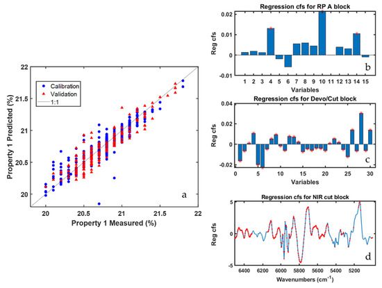 ROSA results for Property 1 prediction (all data blocks were modelled simultaneously). Predicted vs. measured value plot (a); regression coefficients for the RP-A (b); Devo/cut (c); and NIR cut (d) data blocks. Red stars indicate variables having VIP scores higher than one.