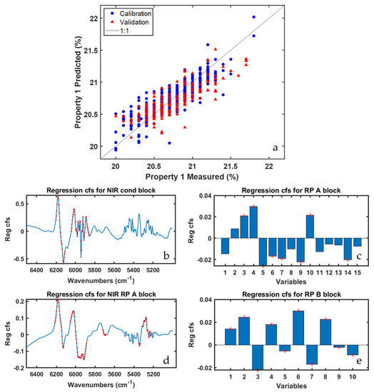 ROSA results for Property 1 prediction (‘ROSA no cut zone’ model). Predicted vs. measured value plot (a); regression coefficient for NIR cond (b); RP A (c); NIR RP A (d); and RP B (e) data blocks. Red stars indicate variables having VIP scores higher than one.