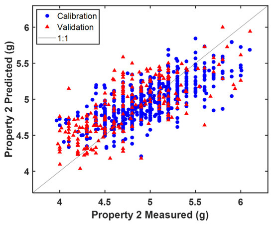 In Figure 5 is where the predicted vs. measured value plot resulting from the ‘MB-PLS all’ model is shown. By inspecting the corresponding residuals plot (not shown for the sake of brevity) it can be observed that, on average, the 2021 production campaign (validation set), yielded lower values of Property 2 than that conducted in 2020 (calibration set). This deviation explains the relatively high difference between RMSEP and RMSEC and RMSECV. However, the presence of a reasonable amount of validation samples in the whole calibration range was guaranteed and the company deemed the prediction error acceptable for routine monitoring.