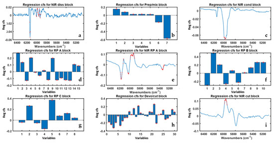 Regression coefficients resulting from the ‘MB-PLS all’ model for each data block the letters (a–i) refer to the different block whose name is reported on top. Red stars indicate variables exhibiting VIP scores higher than one.