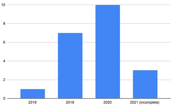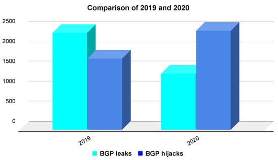 The analysis of BGP attacks [] in the last two years shows that BGP hijacking has increased. The comparison is shown in Figure 1. However, reality shows that the reaction to these events is not quick enough. For instance, on 1 April 2020, the Russian telco services provider Rostelcom was involved in an incident impacting more than 8800 prefixes []. This event influenced companies such as Amazon and Akamai. In July 2020, the ATLDC Tulix Systems caused an incident where they announced 145 incorrect prefixes. These erroneous prefixes lasted for almost an hour []. For example, a significant BGP leak occurred in June 2019; the provider China Telecom accepted more than forty-thousand routes from SafeHost []. The announcement contained prefixes already present in the global BGP table or non-existent prefixes. As a result, the China Telecom spread them to its neighbours, which caused a global issue.