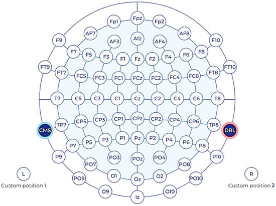 First, we used the 32-channel EPOC FlexTM (shown in Figure 1) from EMOTIV (https://www.emotiv.com, accessed on 16 October 2021), at a sampling rate of 128 Hz. The EPOC Flex is a wireless EEG machine with flexible traditional EEG head cap systems that minimizes the setup time. It measures the electrical brain potentials via saline electrodes and saline soaked felt pads, while it is flexible and easy to use. We also checked that (and adjusted) each electrode’s position placed on the right area. EEG signals were collected using Emotiv Pro [ver. 3.1.3]. We explored the brain response from whole EEG electrodes using topographic brain mapping, in order to verify the proposed visual stimulus patterns. Moreover, the specific EEG electrode positions of interest are around the occipital and parietal areas [], i.e., PO3, PO4, POZ, O1, O2, and Oz, as shown in Figure 2, for practical BCI systems with a single or a few electrodes.
