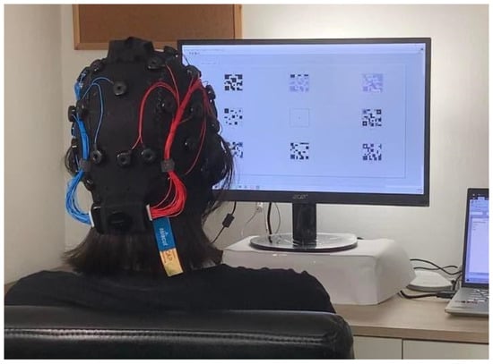 A brain–computer interface (BCI) is an emerging human-computer interaction (HCI) technology used to communicate between the human brain and computers [,]. A BCI can create a replacement or alternative pathway connection between the brain and prostheses or assistive devices for spinal cord injury (SCI), stroke, and amyotrophic lateral sclerosis (ALS) (also known as neuroprosthetics). Generally, the three main parts of a BCI consist of (1) brain signals and data acquisition, (2) a feature extraction and classification algorithm, and (3) command translation and applications. A non-invasive BCI [] is a popular technique for research and development. A practical BCI system is the primary goal of a non-invasive BCI that requires non-contact and contact sensors for signal acquisition, such as electroencephalography (EEG) [] and near-infrared (NIR) machines []. An EEG is a popular brain signal acquisition system for measuring and recording phenomena that occur rapidly and require high resolution and sensitivity to changes in phase, such as evoked potentials (EPs), transient responses to sensory stimulation. Additionally, an EEG-based BCI system [] can be developed for practical, portable EEG devices that have been designed to facilitate their use through dry electrodes, without conductive gel or saline solution. For medical applications, an EEG-based BCI is usually employed for assistive technology, neurotherapy [], detection, diagnosis [], rehabilitation, and restoration [,]. Besides, non-medical applications, consisting of entertainment, games [], industry [], and transport [], have been applied.
