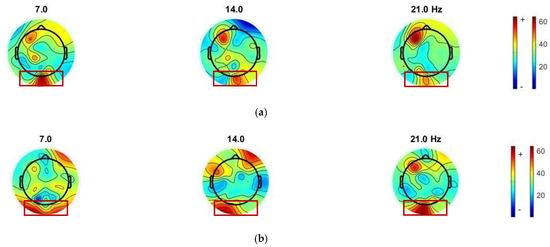 Topographic brain mapping of SSVEP responses of participant 3: (a) SSVEP visual stimulation, using the checkerboard pattern and mixing fundamental flicker frequency at 7 Hz and harmonic frequency at 14 Hz; (b) SSVEP visual stimulation, using the QR code pattern and mixing fundamental flicker frequency at 7 Hz and harmonic frequency at 14 Hz.
