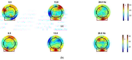 Topographic brain mapping of SSVEP responses of participant 3: (a) SSVEP visual stimulation, using the checkerboard pattern and mixing fundamental flicker frequency at 13 Hz and sub-harmonic frequency at 6.5 Hz; (b) SSVEP visual stimulation, using the QR code pattern and mixing fundamental flicker frequency at 13 Hz and sub-harmonic frequency at 6.5 Hz.