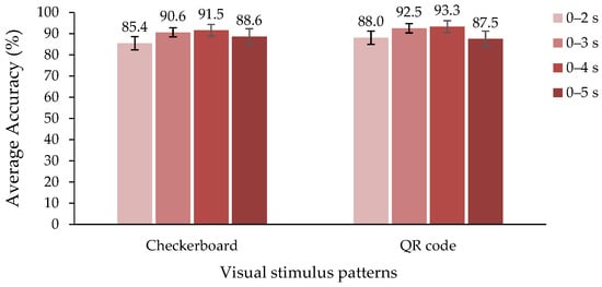 To verify the stimulus duration for SSVEP detection from two different SSVEP stimulus patterns, we used four windows, with 50% overlap, to detect the dominant frequencies, including 2, 3, 4, and 5 s PSD and CCA methods. Less time for visual stimuli can reduce visual fatigue. Hence, we attempted to observe the time and SSVEP classification accuracy between the checkerboard and QR code stimulus patterns for efficiency and visual fatigue evaluation. According to Figure 9, we found that 3 and 4 s, with both stimulus patterns, can provide a high efficiency of the SSVEP methods. The minimum time for SSVEP stimulation was approximately 3–4 s, and the average classification accuracy ranged from 90.6% to 93.3%. The QR code yielded a higher efficiency than the checkerboard pattern for 2 to 4 s. A decrease in classification accuracy at 5 s can occur from a reduced SSVEP intensity at 4–5 s, since an extended period of stimulus can lead to visual fatigue.