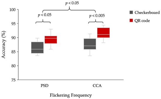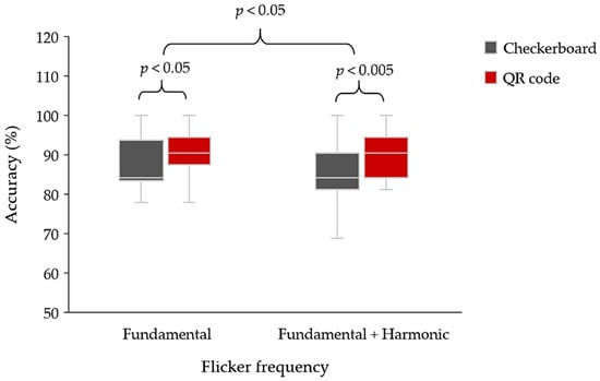 Furthermore, there is a significant difference between using only the fundamental (conventional) and mixing fundamental and harmonic frequencies (proposed); the effect of each pattern was inspected (shown in Figure 10). The paired t-test for the mean was used to analyze a statistically significant difference between the groups of flicker stimuli (Table 2) and visual stimulus patterns. First, the paired t-test (n = 24) indicated that there was a significant difference between the average classification accuracy of using only the fundamental frequency of the checkerboard and QR code pattern (p = 0.010; p < 0.05). The paired t-test (n = 24) also indicated a statistically significant difference between the accuracy of mixing the fundamental and harmonic frequencies of the checkerboard and QR code patterns (p = 0.001; p < 0.005). Second, the paired t-test (n = 48) indicated a statistically significant difference between the average classification accuracy of using only the fundamental and mixing fundamental and harmonic frequencies (p = 0.033; p < 0.05).