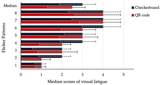 After the experiment, participants were asked about their visual fatigue score for each stimulus (Table 2), affecting their eyes on a scale from 1 to 5, with 1 indicating minimum visual fatigue and 5 indicating maximum visual fatigue. The median is used as a robust measure to conceal higher levels of variability in the visual fatigue score. The results are presented in Figure 12. Flicker patterns 4 to 8 (mixing of flicker frequency) had a more significant effect on the eyes (three to four scores), rather than flicker patterns 1 to 3 (only fundamental frequency), which can provide only one to two scores for both patterns. In contrast, the proposed mixing flickering frequency can yield higher SSVEP responses than the conventional method. Moreover, a comparison of visual fatigue between the QR code and checkerboard patterns showed that the QR code pattern had a median score of 2.5, while the checkerboard pattern had 3. However, there was no significant difference between the QR codes and checkerboard patterns, even though nine out of twelve participants (75%) recommended the QR code pattern for less visual fatigue.