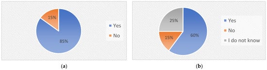 - Question: “If the study was full-time, would you ask the teacher for help with programming rather than through online study?” For the question, up to 85% (n = 17) of students responded with “yes” and only 15% (n = 3) of them selected “no” (see in Figure 1a).