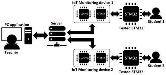 The practical form of teaching is the most effective one as students can understand things correctly. Therefore, the goal of teachers is to create tools for practical teaching, whether in full-time teaching or online teaching by the virtual laboratories (VLs), which is confirmed by [,,,,,,,,,,,,,,]. The publication [] focused on mechanical engineering in India states that students can only understand the curriculum well if they experiment in the laboratory. The pandemic also moved teaching to an online form, leading to creating a virtual fluid mechanics laboratory. According to the results, the application of the laboratory has led to a high level of satisfaction on the part of both students and teachers, and the system helps to improve teaching skills. Another VL is described by Thinshe Chmunorwa et al. where the IoT education system, based on the myRIO, is used for student work to apply ambient light, proximity, and temperature sensors []. Jakub Svatos et al. [] present the created Home Lab system, thanks to which students can receive practical training in electronics. In this project, the STM32 microcontroller fulfills several tasks: signal acquisition via ADC, PWM generator, voltage generator, voltmeter, and logic analyzer. The student can share the results via a remote screen and consult with the teacher. Remote learning of STM32 microcontrollers can also be mediated through the TeamViewer and STM32 Cube Monitor software, thanks to which the student can connect to and work with the microcontroller from home []. The hardware in the loop method, which has proved successful in the case of [], can also be a helpful tool, where students can use the STM32 microcontroller to control power electronics circuits. This method can be beneficial in online teaching and maintain the quality of teaching even if students do not have direct access to laboratories. Due to COVID-19, and from the facts described above, it is clear that there is an urgent need to find ways to improve the quality of online learning and adapt STM32 lessons for a remote form. It is necessary to eliminate the shortcomings of remote learning and replace them with innovative tools that will improve teaching from the perspective of students and teachers. Therefore, this paper describes a unique IoT remote laboratory focused on improving microprocessor technology. The aim is to combine the advantages of simulators and real electronic components so that the quality of education is maintained even during online teaching. In the microprocessor technology course, students learn to work with the basic peripherals of STM32F446RE microcontrollers. The successful creation of an IoT remote laboratory can be an extended idea [,,], where a teacher can connect to a student microcontroller during a lesson and monitor the status of his work.