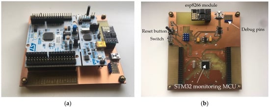 A hardware part of the IoT remote laboratory: Student Nucleo-64 board connected to the IoT monitoring device (a) and created PCB (b) with equipped monitoring microcontroller STM32F446RE, IoT module esp8266, and the other required components.