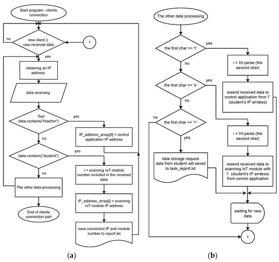 The shown flowchart describes the server program operations from the start of the server up to received data processing. The first flowchart (a) describes how clients connect to the server and save the data to a text file. The second flowchart marked as (b) is part of the first flowchart where the block “The other data processing” is extended and described.