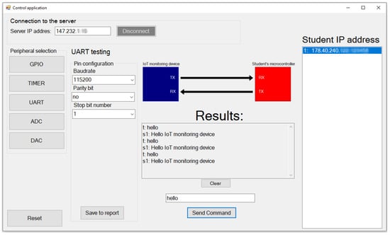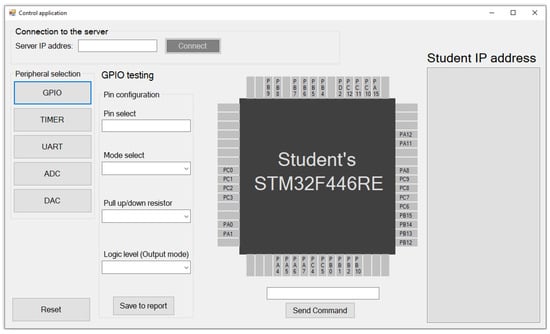 The control application used by the teacher presents the primary control part of the whole device. The application includes several control/test parts, such as I/O pins or peripherals testing. The school subject, where the IoT system is used, includes GPIO (General-Purpose Input Output) learning, timers where PWM is generated, or Input Capture mode is applied. In this mode, students are tasked to determine the length of time between two events or to measure the period and duty cycle of the PWM signal. The A/D or D/A converters are the other essential peripherals that the system includes. Moreover, the last part is the USART/UART communication peripheral between the control application and the student microcontroller.