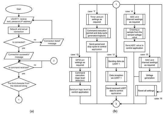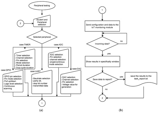 The shown flowcharts mainly create control application functions. The first part marked as (a) describes the selection of the tested peripherals and the manual input of peripheral configurations, or the selection of data sent to the server and subsequently to the IoT monitoring device. The (b) is a continuation of the first part of the algorithm, which describes the method of receiving the response from the IoT monitoring device, its display and storage in the report.