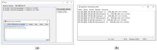 Figure 9a shows the server application on which the connected devices are visible in the “Connected clients” section. This window shows the IP address of the teacher marked “t:” and the student marked “1”, which represents module number 1. The application main window displays the report of connection and disconnection from the server. After a successful connection, the student can work on his tasks and the teacher can follow the development of the program on which the student is working by testing the peripherals. Of course, it depends on the currently covered topic, according to which the teacher chooses the peripheral he wants to monitor. In Figure 9b, all the stored connections and disconnections are shown in a report.txt file.