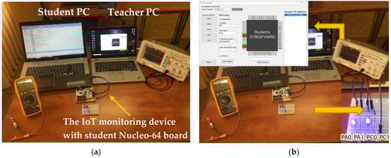 (a) Workplace of a remote laboratory with a teacher PC, a student computer, and the IoT monitoring device with measuring devices (multimeter and oscilloscope). (b) GPIO pins monitoring where PA0, PA1, PC0, and PC1 pin was tested.