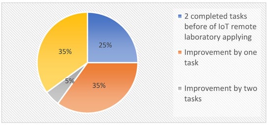 From the above findings, it can be concluded that up to 40% (n = 8) of students of the group increased in their success of solving tasks during the class. In comparison, 25% (n = 5) of the total group of students performed two tasks before the implementation of the IoT remote laboratory, and 35% of the total students did not improve their performance. As a result, a total of 15 students were able to improve, of which up to 53% (n = 8 of 15 students) had improved results.