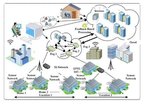Several physical servers combined in an FN configuration to cover a specific diameter region. The fog nodes (FN) can be wired or wirelessly connected [23,24,25]. The FN provides processors and sets up the equipment and network services as a small virtual data center. The processors, software, and network services made up the fog nodes (FN). Smart sensors (SS) collected data from the surrounding environment, which FN analyze and uses to understand decision-making better. The FN also provides a 5G network with a limited range of unicast wireless connections. Concurrent data transfer is enabled by the newly created 5G network protocols, which allow packets to be sent to all or a selected destination simultaneously [26]. The FN, a storage system for passive memory resident programs, can include the local database. For heavy IoMT applications, this means faster processing and loading times [27]. The Internet of Things in the Medical Field (IoMT) is a network safety, reliability, bandwidth, and optimization application that affects IoMIs, IoMT, and IoMT network safety deployment, reliability, bandwidth, and latency optimism. In this context, several FNs provide dynamic information as represented in Figure 8.