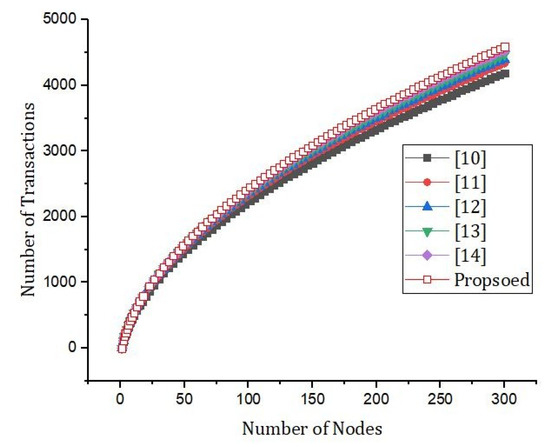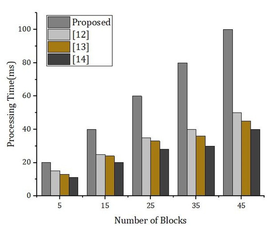Figure 19 describes the simulation results based on the number of blocks and the processing time. We compared our proposed framework with the benchmark models. The performance achieved by our proposed framework was better than the benchmark models.