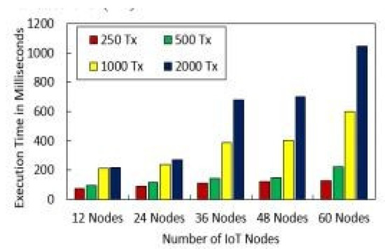 Registration against harmful actions is required for IoT nodes. Algorithms 1 and 2 illustrate how long it takes various IoT nodes to register. As can be seen in Figure 4, the real upload time for IoT sensor data with IPFS protected storage and the number of transactions is shown. As the number of transactions rises, so does the upload time. Block mining time, block creation time, and block access time are shown in Figure 5 and Figure 6. As might be predicted, as the number of IoT sensor nodes grows, so does the elapsed time. The system design and suggested topology are shown in Figure 5 and Figure 6. In the proposed system, the transaction sign guarantees non-repudiation. Figure 5 and Figure 6 show our suggested system’s security and access control module.