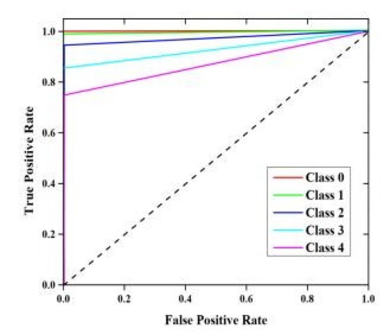 Figure 17 represents the simulation results based on the true positive rate and the false positive rate. We classified the IoT data into different classes based on TP and TN.
