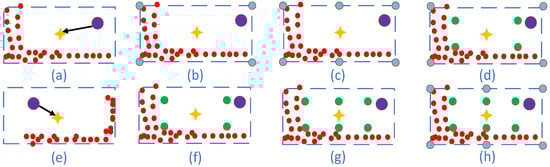 Various BEVs (bird’s eye views) of predicted bounding box. The purple circle refers to the predefined anchor point, which predicts the 3D bounding box. The blue circles refer to the extracted keypoints on the boundary, and the green circles refer to the extracted keypoints inside the bounding box. The blue dashed line refers to the BEV of the predicted bounding box. The red circles refer to the point on the detection object scanned by the LIDAR, the yellow star refers to the center location of the bounding box. (a,e) denote different relations of predefined anchor points and bounding boxes. (b,c) denote different distribution of boundary keypoints of the bounding boxes. (f,g) indicate different distribution of inner keypoints of the bounding boxes. (d,h) indicate different Point out the different sampling methods covering the boundary and inner parts.