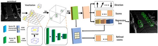 Nowadays, object detection has become a fundamental task of scene understanding, attracting much attention in various fields, such as autonomous vehicles and robotics. The tasks include traffic sign detection [1,2,3], traffic light detection [4,5], 2D object detection [6], and 3D objection detection [7,8], which rely on sensors installed on the autonomous vehicles. Since LiDAR (light detection and ranging) can provide accurate distance information about the surrounding environment and is not impacted under low-light conditions, it has become one of the main sources of perception. The purpose of 3D object detection of LiDAR point cloud is to predict the bounding box, classification, and direction, an essential job for downstream perception and planning tasks.