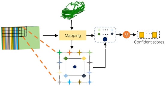 where denotes the total number of inner points. . is a uniform representation for mapped coordinates of the keypoint. represents real-world coordinates; moreover, . x, y are the coordinates with respect to the LiDAR coordinate system. Typically, is fractional; thus, the value is calculated by bilinear interpolation with the adjacent position. signifies the coordinates offset and scale, . are the coordinates with respect to the feature map. The mean value of all keypoints is calculated as final scores.