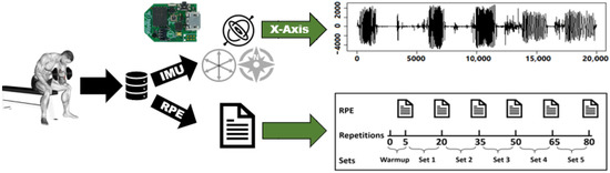 We ask twenty-five volunteers to perform concentration curls while we use the following tools to construct our dataset: (1) We attach a 50 Hz Neblina inertial measurement unit (IMU) to the volunteer’s wrist to measure its acceleration and calculate the linear and angular velocities. Previous studies show velocity loss as an early indicator of muscle fatigue during resistance training, especially when blood lactate and ammonia accumulate in muscle tissues [46,47,48]. (2) We attach an Apple Watch Series 4 to the volunteer’s opposite wrist to measure their heart rate during the exercise. (3) We provide the volunteers with a 4.5 kg weight dumbbell to perform concentration curls. (4) We provide the volunteers with Borg’s scale presented in Table 1 to express their fatigue levels. Such a scale is often used as a subjective method to estimate the rate of perceived exertion (RPE), which expresses the fatigue intensity during an exercise. During data collection sessions, we ask each volunteer to complete 5 warm-up repetitions followed by 15 repetitions per set for a total of 5 sets per hand, as shown in Figure 2. Moreover, the volunteers report their RPE after each set, including the warm-up, yielding 6 RPE values per hand.