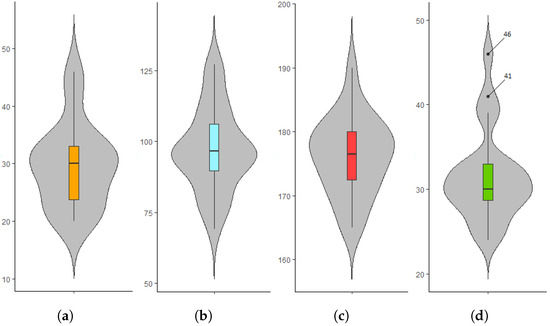 Boxplots to display the distribution of volunteers’ age, weight, height, and BMI in our dataset. (a) Age (years). (b) Weight (kg). (c) Height (cm). (d) BMI (kg/m).