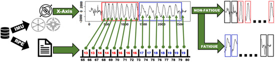 Initially, our dataset contains six signals from the two 3D-accelerometer’s signals (x, y, z) and the gyroscope. We start by extracting and labeling the repetitions into fatigue and non-fatigue repetitions. Figure 4 shows an example of the fifth set of repetitions in its raw data form. In this example, the raw data are extracted from the gyroscope’s x-axis along with their corresponding RPE values reported by the volunteer. A previous study on quantifying muscle fatigue suggests an RPE value of 16 as the threshold of true fatigue to estimate the declines in muscle strength during tasks [65]. Therefore, we extract and label each repetition manually according to the RPE values reported for the set, where we label repetitions with reported RPE values larger than 16 as fatigue and others as non-fatigue repetitions. The figure shows two distinct groups of non-fatigue and fatigue repetitions extracted from the set. The troughs indicate full extension, while peaks indicate full flexion. We repeat the same process for the remaining 4 sets.