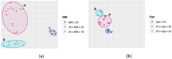 Physical characteristics of people (e.g., age, weight, height, or BMI) vary from one person to another within a large population. Such differences can affect the way people move and perform physical activities. We believe that a user with different physical traits, e.g., age and BMI, may show signs of fatigue differently. At the same time, we expect groups of people who share similar physical traits to show similar signs of fatigue [80,81]. For example, let us capture the signs of fatigue using the three fatigue-related features, skewness, IoP, and MSP, and plot the principal component analysis (PCA). In Figure 6a, we often observe that individuals within specific limits of BMI values tend to share similar signs of fatigue. Moreover, Figure 6b shows similar observations where we use age instead of BMI. We can observe that individuals of certain ages tend to share similar signs of fatigue. This strengthens our hypothesis that if we construct the training data from individuals within the population who are more similar, it may reduce the inter-subject data variability and hence improve the performance of the fatigue detection model.