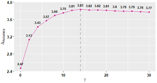 Figure 7 shows the average changes in both models’ performance as the value of increases. The performance in this context is measured using accuracy. We use the accuracy at as the reference point to measure the changes in accuracy () as the value increases. We observe that increases as the value increases until both reach maximum values of 3.83 and 14 at the dashed line, respectively. Then, the changes in accuracy start to decline as the value continues to increase. Therefore, we select the to let the models perform at maximum accuracy.