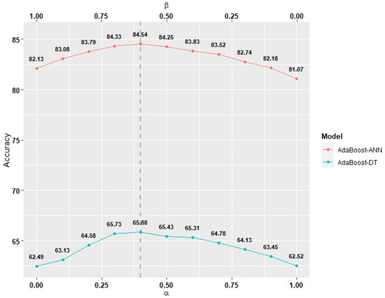Our approach to address RQ1 is that we examine the possible values for the parameters in Equations (2), (4) and (5) so that we observe the impact of these parameters on the models’ performance. We start with Equations (2) and (4) to examine , which has an arbitrary value between (0, ∞). To observe the impact of the different values on the models’ performance, we employ each value to run two pairs of models: AdaBoost-DT and AdaBoost-ANN. The first pair is physical similarity-based models of AdaBoost-DT and AdaBoost-ANN, while the second pair is signal similarity-based models of AdaBoost-DT and AdaBoost-ANN. Then, we compute the changes in these models’ performance as the value of increases and select the gamma value that corresponds to the best performance. In Equation (5), we examine the physical and signal parameters while satisfying the condition . We experiment with different and values and observe the effect by running two similarity-based models (AdaBoost-DT, AdaBoost-ANN). Then, we compute the models’ performance as the values of and change; then, we select the values that correspond to the best performance.