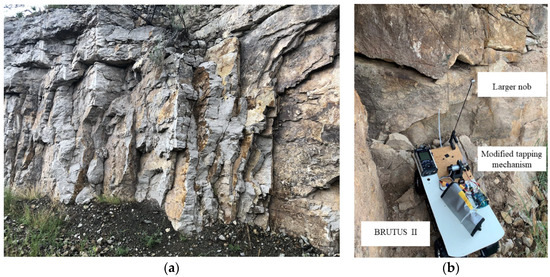 Figure 6. Field experiment: (a) Roadcut testing site; (b) modified UGV, BRUTUS II.